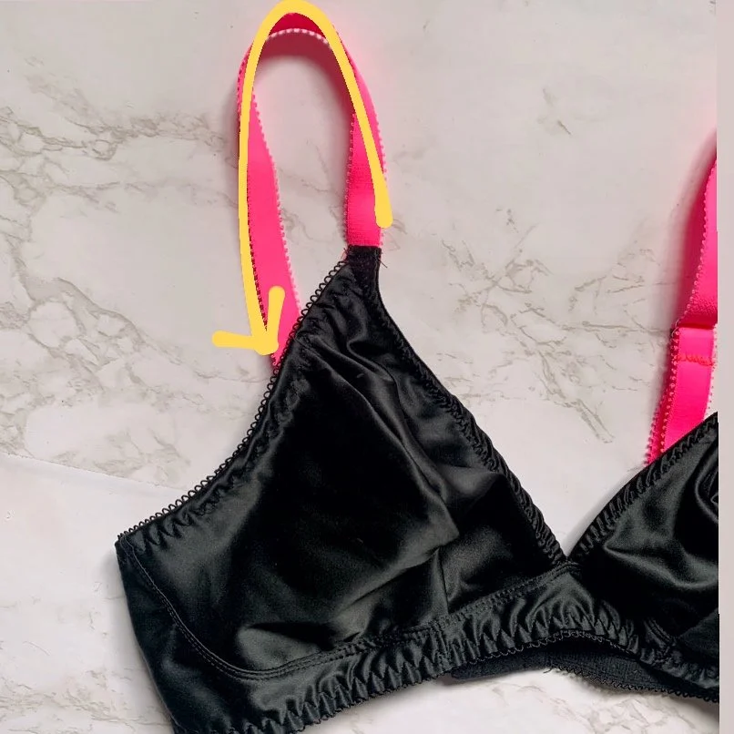 A split strap bra is where the the strap is literally two straps, the front strap and the back strap. Reasons for two straps? Could be you want a decorative front strap, satin covered bra strap, or want more rigidity in the the strap if you’re designing for bigger boobs so the boobs don’t bounce as much, as the there is not stretch in the front strap. Or you could simply want two different colour bra straps for design.