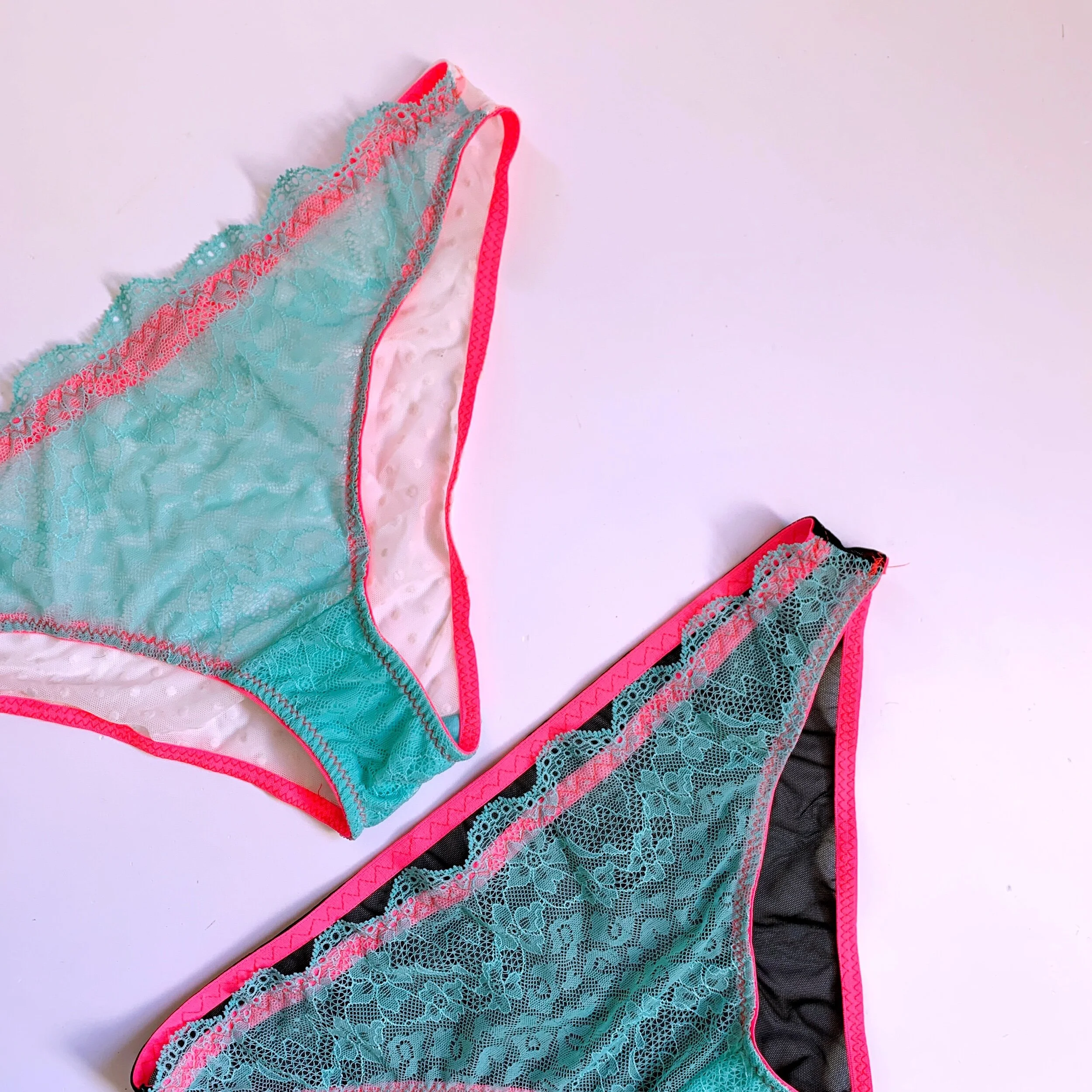 I would use the 3-step stitch behind edges of lace on the waist (or neckline or under-band) like on the brief shown. As well as under edges of elastics, I also tend to use the 3-step stitch on woven briefs or bras as you have to gain a lot of stretch over a small area of the garment, to (example) pull the briefs on and off, and find 3-step a better choice for this.