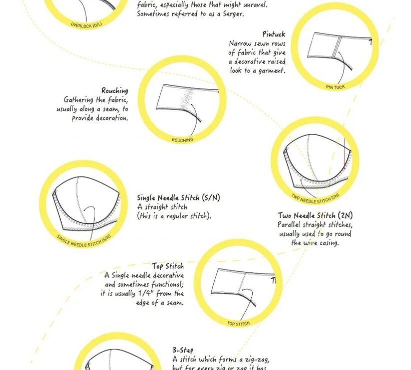 An example of different types of stitching from the book “how to write a bra and brief tech pack”