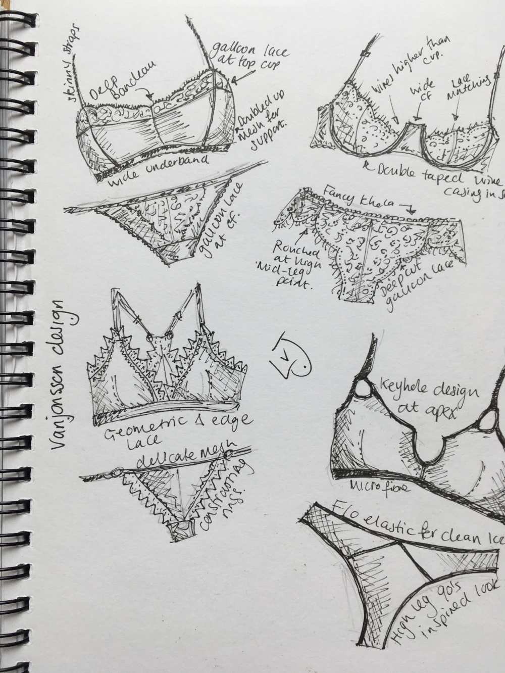 This is a look into my sketchbook, a place I go to draft out new ideas and thoughts, so I can look back when I need inspiration to design. Nothing is neat, polished or refined, but by being able to jot down shapes, inspirations or thoughts it counter balances all the time spent designing technically that is required when producing lingerie.